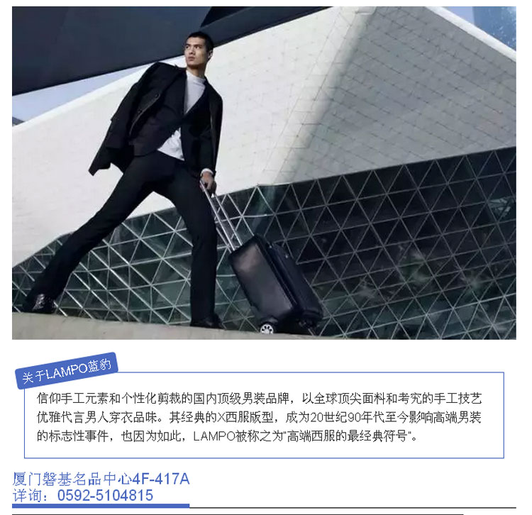 穿着西服的挺拔男人总是最具魅力的,他们将男性优雅演绎的淋漓尽致,在身材与西服的良好默契之间,展露气质与自信。高端西服的最经典符号LAMPO蓝豹,欢迎莅临选购!