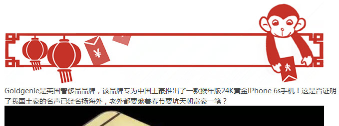 Goldgenie是英国奢侈品品牌,该品牌专为中国土豪推出了一款猴年版24K黄金iPhone 6s手机!这是否证明了我国土豪的名声已经名扬海外,老外都要瞅着春节要坑天朝富豪一笔?